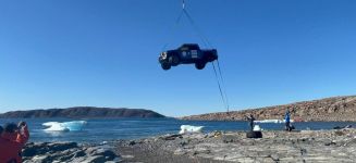 A vehicle lost in the ice near Qikirtat is operated by Arctic Trucks AT44 F-150 (Tasmania) Islands, Nunavut, on 23 March 2022. Four Inuit team members were included in the group of 12 people on the extraction crew, and the highly-experienced international recovery team worked closely with regional administrations and local communities.