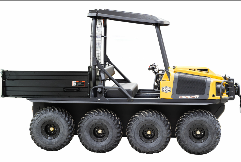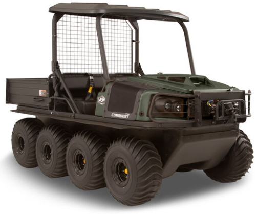 Conquest Pro 950 8x8 XTX 8x8 is powered by a Briggs & Stratton Vanguard gasoline engine measuring 993cc (60.59 cu. in.). It is equipped with a two-speed ADMIRAL transmission and produces 40 horsepower. It is capable of carrying up to 848 pounds. On land, 385 kg. The vehicle is capable of towing 2,000 pounds. The weight is 907 kilograms. Depending on the configuration, it can be tracked or untracked.