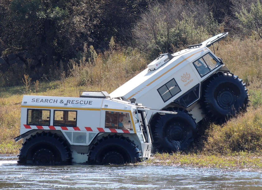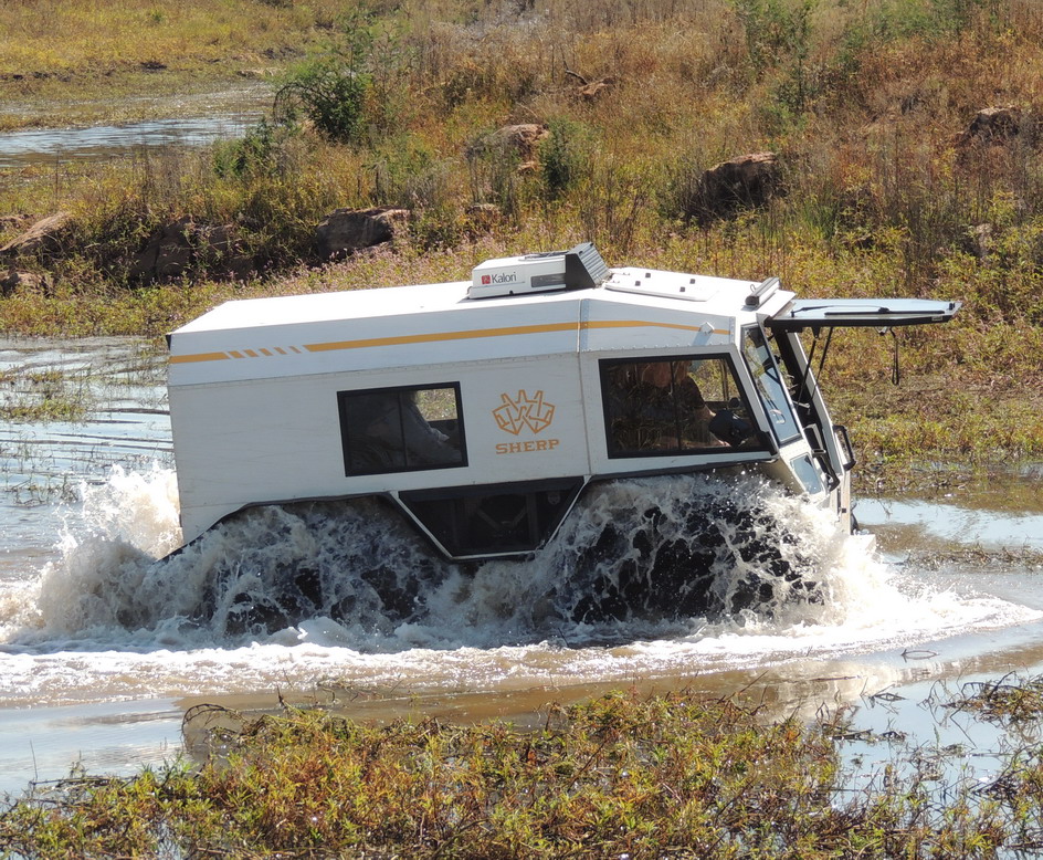 In addition to carrying six people, the Sherp Pro can carry more than 1 000 kilograms of payload. On land, it can reach a top speed of 40 km/h and on water, it can reach a top speed of 6 km/h. It is capable of operating in temperatures rangiFour people can be accommodated in the main vehicle and 18 in the trailer of the Sherp Ark. main vehicle and 18 in the trailer.